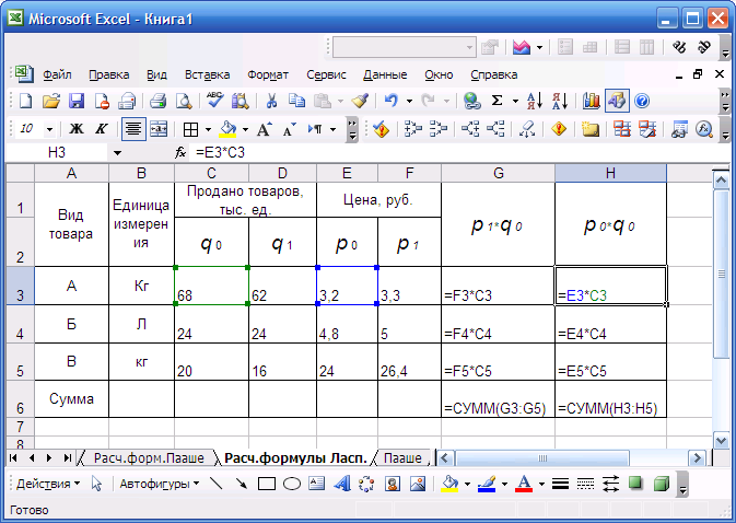 Расчёты так же выполнены с применением табличного процессора Excel в среде Windows. Расположение на рабочем листе Excel исходных данных и результатов расчёта (в формате Excel) представлены в таблице 2.4. Расположение на рабочем листе Excel расчётных формул, используемых для вычисления индексов Ласпейреса и Пааше ( в формате Excel) представлены в Приложении 2.