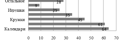 Тройку лидеров по популярности среди подарков составляют оригинальные сувениры (74%), алкоголь (72%) канцелярские товары (69%). Треть опрошенных компаний используют в качестве подарков собственную продукцию (27%) или скидки на свои услуги (30%) (рис.2).