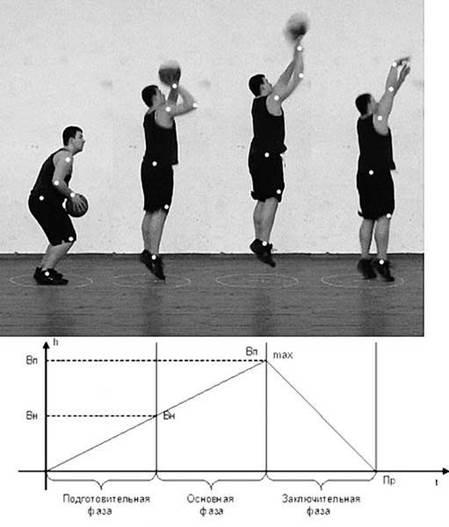 Видеограмма фазовой структуры броска мяча по кольцу в прыжке с места с дистанции.