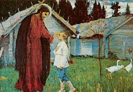 Возвращаясь к «Благословению», вглядимся внимательнее в отрока. Образ его лишен исторической конкретности. Это и Варфоломей (хотя в житии Сергия Радонежского мы не найдем этого эпизода с Христом), это и мальчик из «Души народа». Образ трансформировался, став философски-обобщенным, превратившись в символ духовного служения Высшему Идеалу. Служения жертвенного. И потому так трагичен лик Христа, в благословляющем жесте которого столько затаенной отеческой нежности.