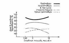 Рис. 73. Структура грузооборота торговых оптовых баз различной площади