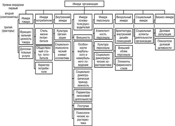 По мнению В.М. Шепель, автора книги "Имиджеология, как нравиться людям", структура имиджа корпорации может включать до восьми основных компонентов: