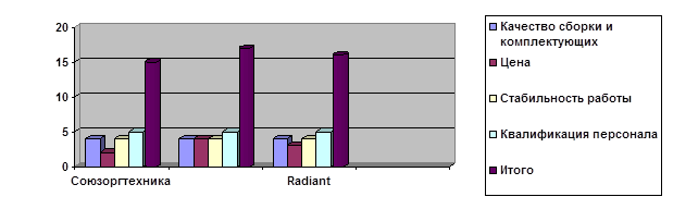 Причем у «лидера» конкурентоспособности – фирмы «Прагма» - завышенный курс доллара – 31,85 руб. (следовательно, и цены в рублях получаются выше), в то время как у фирм «Союзоргтехника» и «Radiant» - 31,50 руб., и работает мощная система скидок (см. приложение 2). У фирм «Союзоргтехника» и Radiant никаких скидок нет.