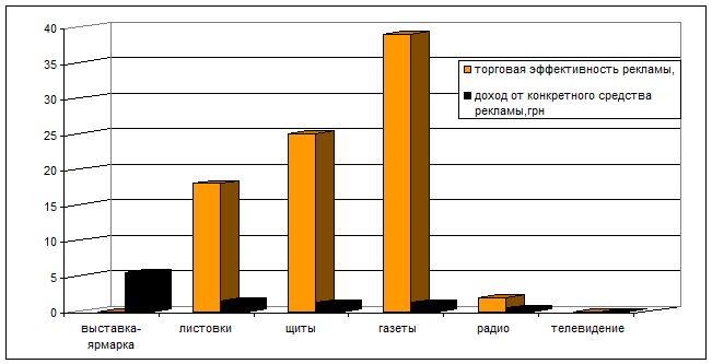 По результатам таблицы №3.5. общая торговая эффективность составила 10грн./грн., это значит, что с каждой гривны вложенной в рекламную компанию фирма получила 10грн. дополнительного дохода. Наибольший доход принесла фирме выставка (5500грн.), но за счет высоких затрат на нее торговая эффективность выставки лишь на 4-м месте (8грн./грн.). Газеты заняли первое место по торговой эффективности (39грн./грн.) среди других средств рекламы, хотя они принесли лишь 1250грн. дохода затраты на данный вид рекламы были самыми низкими. Эффективность щитов чуть ниже – 25грн./грн. – однако доход от них также составил 1250грн. Эффективность листовок составила 18грн./грн., а радио – 2грн./грн.