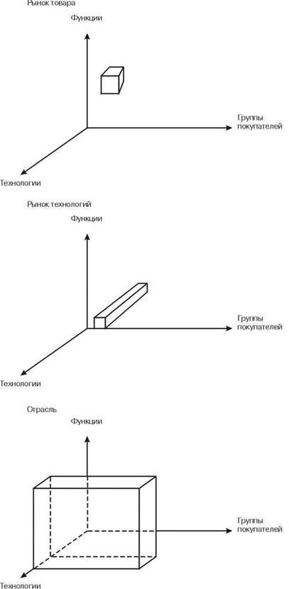 Используя данный подход, можно провести разграничение между тремя различными структурами: рынком одной технологии (отраслью), рынком одной функции (технологическим рынком) и товарным рынком.