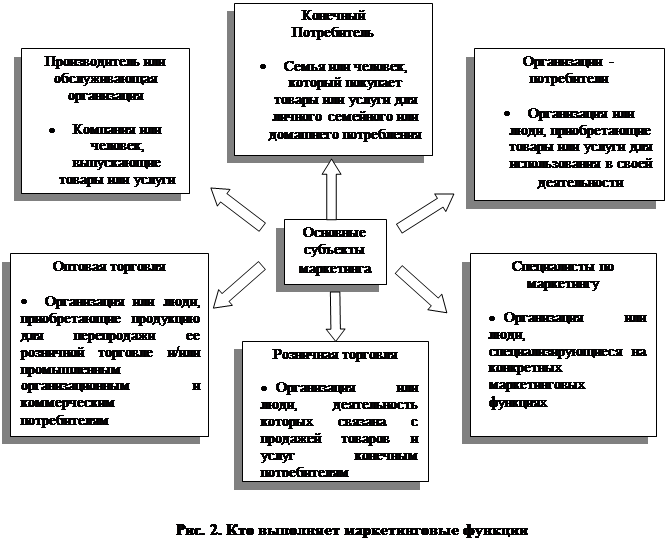 Субъекты маркетинга включают производителей и организации обслуживания, оптовые и розничные торговые организации, специалистов по маркетингу и различных потребителей. Как показано на рисунке 2, у каждого из них своя роль. Важно отметить, что хотя ответственность за выполнение маркетинговых функций может делегироваться и распределяться различными способами, совсем ими в большинстве случаев пренебречь нельзя, они должны обязательно кем-то выполняться.