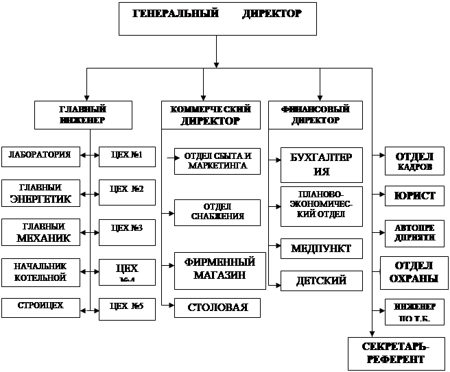 Организационная структура предприятия утверждается Советом предприятия в составе 35 человек. Они являются ведущими мастерами производства, начальниками цехов, различных служб. На основе их предложений вносятся изменения в организационную структуру предприятия. Заседания Совета предприятия созываются 2 раза в год. В своей работе Совет руководствуется отсутствием простоев на тех или иных участках производства. На последнем заседании Совета была выработана следующая организационная структура согласно рисунку 1.1.