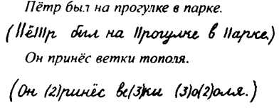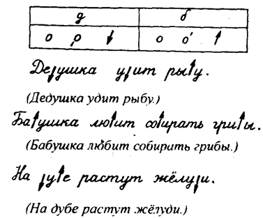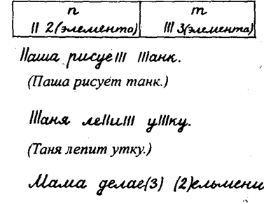 Однако в период обучения грамоте дети пишут еще очень медленно, и передача на письме собственных мыслей, хотя бы и в виде всего лишь одного слова, становится возможной отнюдь не сразу, а лишь на третьей-четвертой неделе обучения грамоте. На втором месяце дети могут записать предложение из двух-трех слов, взятое из их собственных рассказов, а на третьем месяце — два или даже три небольших предложения.