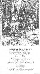 К числу поздних нововведений в этом сюжете относится включение в него эпизода с переездом Святого семейства через реку в лодке; кормчим в таком случае предстает, как правило, ангел. Этот мотив встречается в итальянской и французской живописи XVII-XVIII веков. Порой перевозчиком оказывается Харон - лодочник из древнегреческой мифологии, перевозивший души умерших через реку Стикс в царство Аида. Так эту сцену изображает Пуссен, а вслед за ним Буше. Объяснением такой экстравагантной трактовки бегства в Египет служит желание художников дать предсказание смерти Спасителя. Иногда эта идея подчеркивается включением в композицию ангела, являющегося в облаках и держащего Распятие. Особое подчеркивание типологических аспектов бегства в Египет, как и множества других сюжетов, мы находим в иллюстрациях этого сюжета в "Библии бедных" (Biblia pauperum): внимание художника привлекли два момента в этой истории - путешествие Святого семейства и падение идолов. Богоматерь с младенцем едут на осле, которого ведет Иосиф. Святое семейство в окружении четырех пророков, у каждого из которых по свитку с текстами, предзнаменующими бегство. Иеремия: "Я оставил дом Мой; покинул удел Мой"; Осия: "Пойдут искать Господа и не найдут Его"; Давид: "Далеко удалился бы я, и оставался бы в пустыне"; Исаия: "Грядет в Египет. И потрясутся от лица Его идолы Египетские". И это еще не все. С левой стороны изображена Ревекка и возле нее Исав с дубиною и Иаков. Надпись поясняет, что когда Ревекка узнала о намерении Исава убить Иакова, она отослала последнего в другую страну. Это, согласно концепции типологии, прообраз бегства Иисуса в Египет. На правой стороне Мелхола спускает Давида на веревке из окна - еще один прообраз бегства в Египет. Нижняя часть иллюстрации занята изображением Девы Марии с младенцем в языческом храме. Здесь тоже четыре пророка с их текстами. Осия: "Он разрушит жертвенники их, сокрушит кумиры их"; Захария: "В тот день... Я истреблю имена идолов с этой земли"; Наум: "Из дома твоего истреблю истуканов"; Софония: "Господь истребит всех богов земли". Эта программа бегства в Египет является наиболее полной.