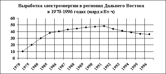 Максимальная в истории дальневосточной энергетики величина выработки электроэнергии была достигнута в 1991 г. - 48,1 млрд кВт-ч. Это в 4,6 раза больше по сравнению с 1970 г. Среднегодовые темпы прироста выработки электроэнергии за 1970-1991 гг. были выше, чем в среднем по России, и составили 7,5%. Столь высокая динамика в этот период связана с реализацией программ электрификации Транссибирской железнодорожной магистрали, а также ростом энергопотребления в промышленности и жилом секторе. После 1991 г. наблюдается постепенный спад в производстве электроэнергии, вызванный общим экономическим кризисом в стране. За период с 1991 по 1997 г. падение производства в электроэнергетике Дальнего Востока составило 21,3%, в то время как во всей промышленности более 50%. В целом годовые темпы спада здесь были выше, чем в среднем по России, что свидетельствует о более депрессивном состоянии экономики региона.[19,20]