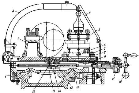 Резцедержатель (резцовая головка) 6 с болтами 8 крепится к верхним салазкам с помощью рукоятки 9, которая перемещается по винту 7. Привод перемещения суппорта производится от ходового винта 2, от ходового вала, расположенного под ходовым винтом, или вручную. Включение автоматических подач производится рукояткой 14.