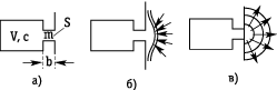 В театрах Древней Греции и Древнего Рима устанавливали так называемые "гармоники" - открытые объемы, горловина которых соединялась с окружающим пространством (рис. 1, а). Масса воздуха m в горловине приводилась в колебательное движение внешним звуковым давлением. Резонансная частота f0 определялась этой массой и гибкостью (сжимаемостью) c воздушного объема V резонатора. При резонансе скорость колебаний v в горле резонатора увеличивается, увеличивается и объемный поток vS ( S - площадь поперечного сечения горла). Ввиду того, что колебательная скорость падающей волны остается постоянной, для поддержания возрастающего объемного потока фронт падающей волны деформируется (рис.1, б). Деформация охватывает тем большую зону, чем больше скорость колебаний в горле. Поэтому резонатор концентрирует значительно большую энергию, чем та, которая содержится в части падающей волны, приходящейся на площадь входного отверстия. После прекращения внешнего воздействия резонатор отдает накопленную энергию в окружающее пространство (рис. 1, в).