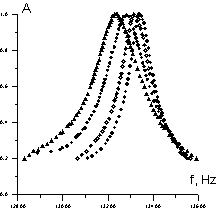 »2500 м/с. Измерения проводились для слабой волны на 4-й моде резонатора и для накачки на 1-й моде, а также - наоборот. На рис.3 приведены резонансные кривые для слабой волны на 4-й моде в присутствии накачки на 1-й моде при различных ее амплитудах. Видно, что с ростом амплитуды волны накачки происходит сдвиг резонансной частоты и расширение резонансной кривой, т.е. уменьшение добротности резонатора