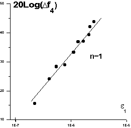 = 1,2…- номер продольной моды резонатора. С пьезоакселерометра сигнал поступал на спектроанализатор (10) для измерения амплитуды накачки, а также через режекторный фильтр (9), подавляющий сигнал на частоте накачки на 30 дБ, на селективный вольтметр (8) и осциллограф (7), где производилось измерение уровня слабого сигнала. Собственные частоты первых продольных мод резонатора при малых амплитудах возбуждения составляли соответственно 2250 Гц, 6800 Гц, 10150 Гц и 16650 Гц, а добротности - 45, 90, 81 и 93. Таким собственным частотам соответствует c0