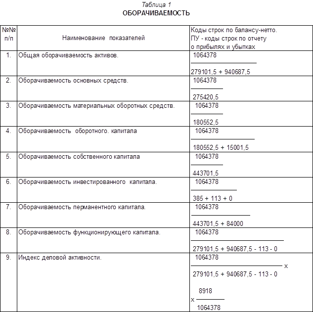 Коэффициенты оборачиваемости имеют большое значение для оценки финансового состояния предприятия, поскольку скорость оборота капитала, то есть скорость превращения его в денежную форму, оказывает непосредственное влияние на платежеспособность предприятия. Кроме того, увеличение скорости оборота капитала отражает при прочих равных условиях повышение производственно-технического потенциала предприятия. Для этого рассчитываются 8 показателей оборачиваемости и один комплексный показатель - "индекс деловой активности", дающие наиболее обобщенное представление о хозяйственной активности