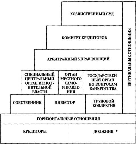 В отношениях несостоятельности может отсутствовать имущественный элемент. Это, в частности, отношения по самоуправлению кредиторов, где их права зависят от размера их денежных требований. Иными словами, в зависимости от размера своего денежного требования кредитор имеет соответствующее право голоса, которое используется при принятии решения. Причем решения такого большинства могут приниматься вопреки воле меньшинства. В этой ситуации имеет место неравное положение участников правоотношений. С другой стороны, при банкротстве некоторых категорий субъектов предпринимательской деятельности в качестве участников выступают органы местного самоуправления, центральные органы исполнительной власти, государственные органы по вопросам чрезвычайных ситуаций, охраны природы и ядерной безопасности, по делам надзора за страховой деятельностью и т.д.