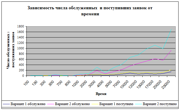 5. График зависимости количества поступивших и обслуженных заявок в системе от времени.