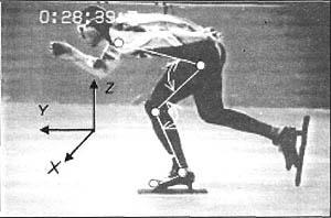 а) исследовали кинематику моделируемой локомоции (бег на коньках по прямой) с помощью видеорегистрирующей методики. Наличие исходных кинематических данных с дискретностью 40 мс (частота видеорежима PAL) дает возможность с приемлемой точностью определить кинематические параметры модели;