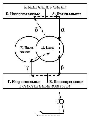 Проследим в этой связи за некоторыми моментами по символическим иллюстрациям. В построении на рис.1 помимо прокомментированных выше факторов движения показаны также его программные компоненты, которые в данном случае соответствуют результату действий спортсмена. Это изменения по программам позы (Д) и положения (Е), являющимся суммой программ места и ориентации (по Г.В. Кореневу и В.Т. Назарову). Анализируя эту схему, можно установить, что любые произвольные движения могут быть начаты только мышечными усилиями, приводящими к изменению позы (А-Д), и никак иначе. Только активно изменяя позу, можно, например, вызвать усиленное давление на опору, необходимое для выполнения отталкивания (А-Д-В). А естественным ответом на это давление - уже независимо от воли исполнителя - будет опорная реакция (В-Г), благодаря которой можно сообщить всему телу ускорение и как следствие получить движение с изменением программы положения (Г-Е). В форме такой же каузальной цепочки выстраиваются многие, особенно сложные, спортивные упражнения, хотя, как будет показано ниже, существует и масса иных действий-движений, имеющих другую каузальную структуру.