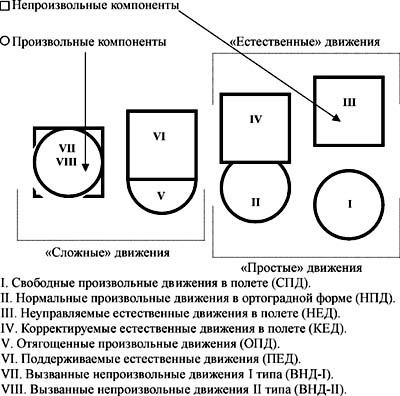 Понятие произвольности связано в данном случае с двигательным действием, подчиняющимся воле исполнителя (см. каузально "простые" движения, рис.1, б). Это понятие не предполагает квалификации качества полученного движения, поскольку произвольное движение не всегда соответствует намерениям исполнителя и может быть ошибочным. Соответственно непроизвольное движение, как было отмечено, обусловливается его физической, биомеханической природой и в определенных условиях возникает помимо воли исполнителя, желает он того или нет (см. рис.1, фиг. ).