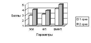 Рис. 3. Сравнительные данные показателей ЖИ, ФП, ВМФП в группе женщин до (1-й срез) и после (2-й срез) эксперимента