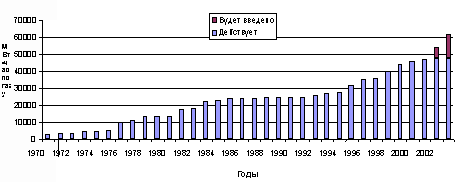 В 1990-е годы бурное развитие получила внутрицикловая газификация для производства электроэнергии, т.е. использование бинарного цикла, при котором горючий газ утилизируется в газовой турбине, а продукты сгорания используются при генерации пара для паровой турбины. Первая коммерческая электростанция с внутрицикловой газификацией – Cool Water, США, шт. Калифорния, мощностью 100 МВт (60 т/ч по углю) была построена в 1983 г. Использовался газогенератор Texaco с подачей топлива в виде водо-угольной суспензии. После 1993 г. в разных странах было введено в эксплуатацию 18 электростанций с внутри цикловой газификацией твердого топлива мощностью от 60 до 300 МВт. На рис.1 приведены данные по мировому производству газа из твердых топлив с 1970 г., а в табл. 1.2 – структура его потребления.