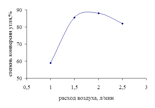 Изучено влияние скорости подачи окислителей на степень конверсии угля. Выбраны основные оптимальные показатели процесса переработки низкосортного обогащенного концентрата: расход воздуха и пара, температура.