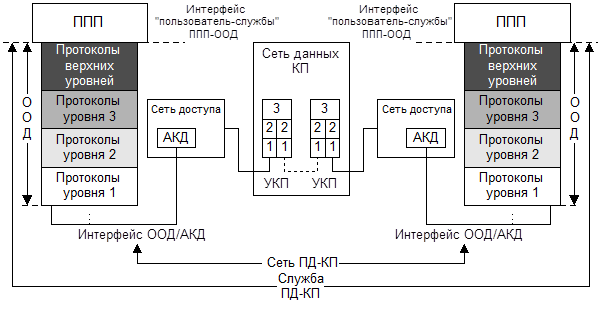 Сеть ПД заканчивается аппаратурой окончания канала данных – АКД. Интерфейс АКД/ООД является границей сети ПД и точкой взаимодействия этой сети с оконечным оборудованием данных (ООД). Узлы коммутации пакетов (УКП) включают три нижних уровня (1-3) протоколов эталонной модели взаимодействия открытых систем по рекомендации МСЭ, а ООД – помимо трех нижних уровней, еще и протоколы верхних уровней.