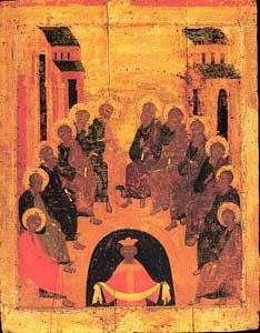 Иногда изображение праздника не имеет единой иконографии, как, например, в иконе Воскресения. И надо сказать, что всегда в изображении какого-либо духовного события становится видимой некоторая немощь. Некоторая невозможность до конца, в исчерпывающей полноте изобразить то, что являлось домостроительным событием в Церкви, потому что содержание всякого Божественного действия в мире безгранично и неисчерпаемо. И иконы в богослужебной жизни Церкви являются частью общего литургического усилия напечатлеть и, можно сказать, воссоздать празднуемое событие. Здесь участвуют и изъяснения отцов, и литургические песнопения, тропари, кондаки, стихиры, песни канона, и, что богослужебно наиболее полновесно, свидетельство Писания: Евангелие и Апостол. Евангелие и Апостол и являются наиболее полным, основным богослужебным свидетельством, уясняющим смысл праздника. Это надо сказать и о празднике Пятидесятницы.