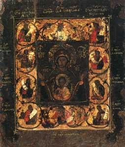 Наиболее характерной иконой такого рода можно признать чудотворный образ Курской Коренной Божией Матери - "Знамение", где Бог Саваоф, окруженный пророками, благословляет Матерь с Предвечным Младенцем Эммануилом.