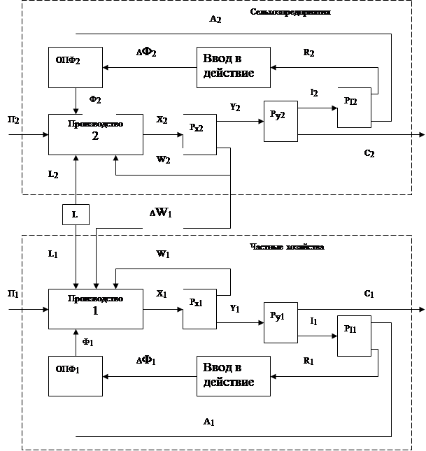 Задачей настоящей работы является разработка модели взаимодействия двух основных подсистем производства продуктов сельского хозяйства в районных АПК, использование которой позволит выработать предложения по методам целенаправленного воздействия на подсистемы для достижения требуемого (желаемого) состояния системы.