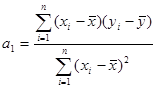 Коэффициент а1 рассчитывается по формуле: , где xi и yi – значения соответствующих признаков, и – соответствующие значения этих признаков; а коэффициент а0 – по формуле: . Коэффициент корреляции определяется по формуле: