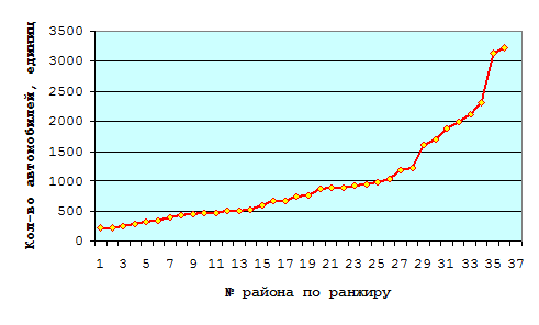 Для начала построим ранжированный ряд по одному из признаков – в нашем случае в качестве примера возьмём наличие автомобилей по 36 районам тверской области (без учёта индивидуальных владельцев) за 2004 год (см. Табл. 10). Графически изобразим изменения значений признака с помощью огивы распределения: