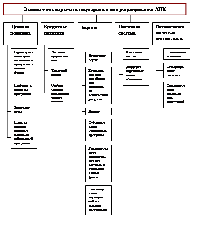 Основными рычагами государственного регулирования являются ценовая, кредитная политика, бюджетные ассигнования, налоговая система и защита товаропроизводителей (схема №2).
