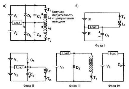 Инвертор Мак-Мюррея содержит два вспомогательных тиристора. Инвертор Мак-Мюррея-Бедфорда не требует никаких вспомогательных тиристоров. Один основной тиристор в этой схеме коммутирует другой основной тиристор. Электрическая схема, рабочие фазы и форма выходного сигнала инвертора Мак-Мюррея - Бедфорда изображены на рис.7. Рабочие фазы этой схемы устройства следующие.