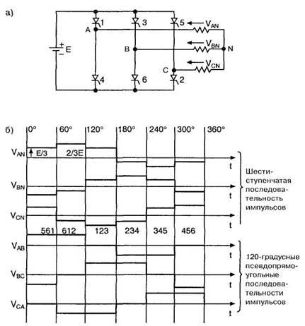 а) Схема трехфазного мостового инвертора,