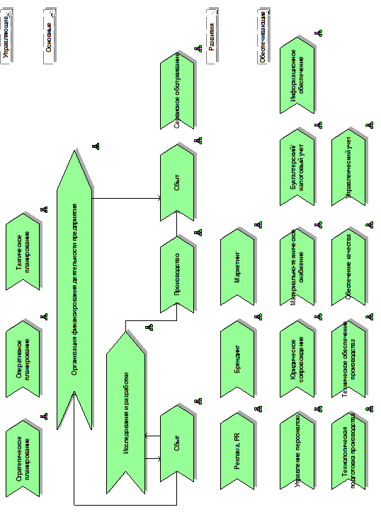 Применение модели построения карты ПВУ дало нам возможность построить индивидуальную модель процессов верхнего уровня обобщения (рис.4), в которой за основу взята классификация, разработанная компанией IDS – SCHEER, предложившей подразделять процессы на основные, управляющие, развития, обеспечивающие. В рамках настоящей работы был произведен анализ 60% формализованных процессов. Из них 48% характеризуются аналогичной ситуацией (система принятия решения состоит из трех и более уровней). Данная ситуация убедительно доказывает, что система принятия решений в рамках заданной организационной структуры управления не представляет из себя не зыблемую основу управления, но, напротив, является средоточением скрытых издержек.