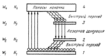 где Npi — число ионов в единице объема, находящихся на уровне i; Wi — разность между энергией уровня i и энергией основного уровня; k=1,38∙10-23 Дж/к—постоянная Больцмана; Т—абсолютная температура кристалла. Обычно энергию основного уровня считают условно нулевой, тогда Wi будет просто энергией i-ro уровня. Значение kT для комнатной температуры (Г=300 К) равно 4,14∙10-21 Дж ≈207 см-1. Поэтому, если Wi>kT (что выполняется для кристаллов АИГ-Nd), населенность уровней 2—4 оказывается действительно малой по сравнений с Npi Причем чем выше уровень, тем меньше на нем находится ионов неодима. Уровень 3 является метастабильным, т. е. время нахождения ионов неодима на нем существенно больше, чем на уровнях 2 и 4.