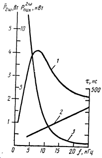Зависимость средней мощности излучения второй гармоники Р2ω от частоты повторения имлульсов /имеет максимум в области 6—8 кГц, что соответствует расчетным данным (рис. 11).